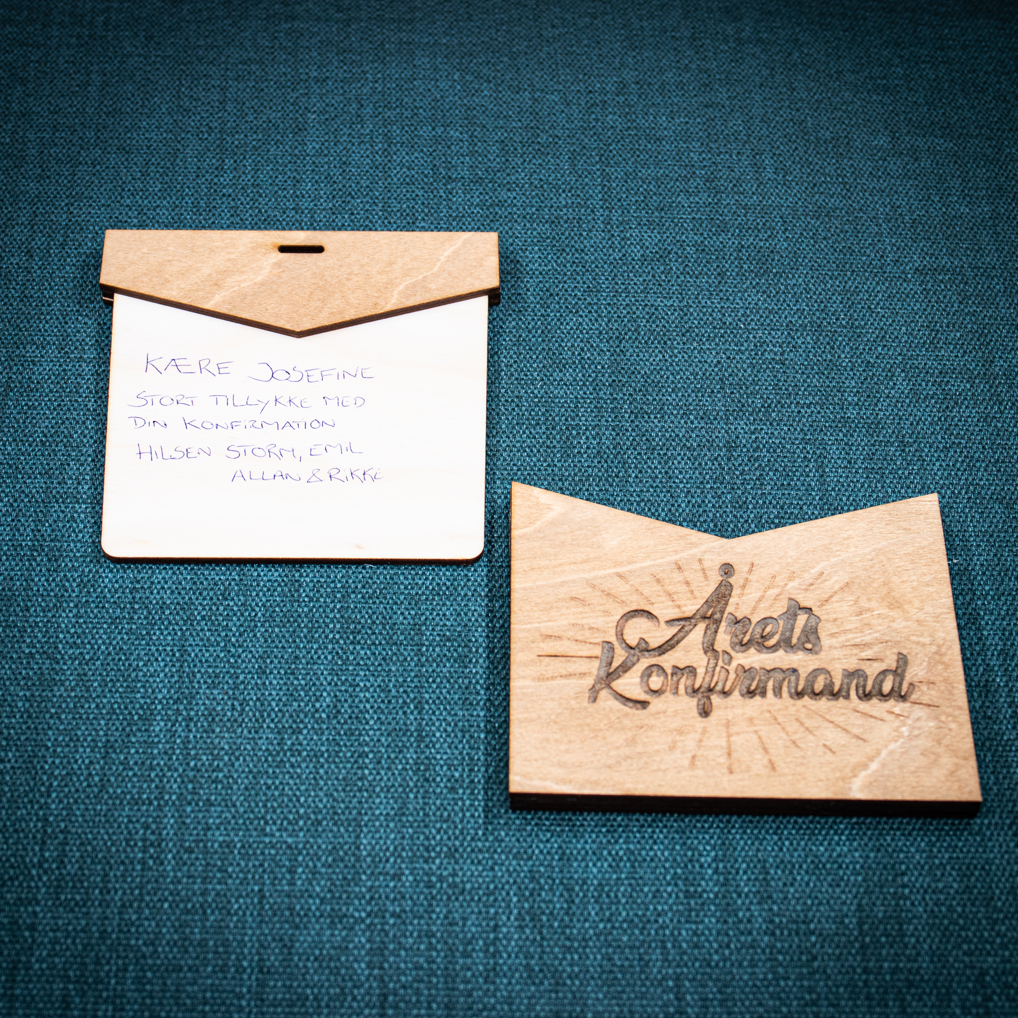 I midten kan der skrives en besked med kuglepen (Skrives der med tusch kan der være fare for at farven fra tuschen trækker lidt ud i træet).